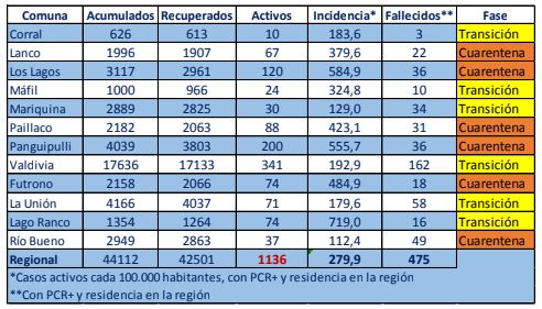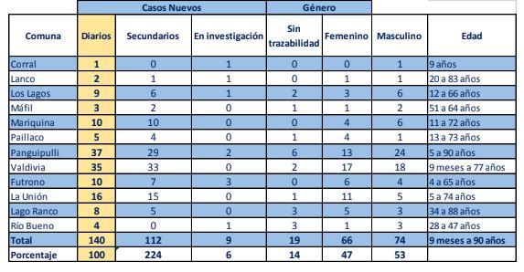 De los 140 casos confirmados por residencia en Los Ríos, 112 corresponden a casos secundarios, 19 aún están sin trazabilidad y 9 se encuentran en investigación. En tanto, a la fecha, la región presenta 44.112 casos acumulados, de los cuales 1.136 corresponden a casos activos, 42.501 a personas recuperadas y 475 a fallecidos.